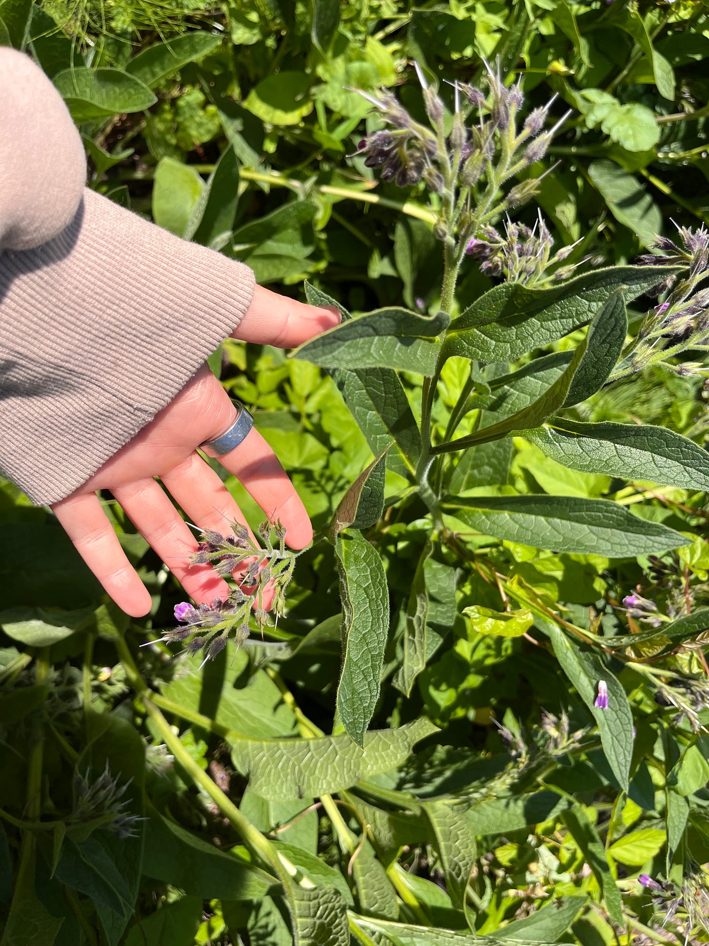 Comfrey is everywhere if you let it be. Its broad, fuzzy leaves and deep roots make it hard to ignore. We’ve pretty much given up on keeping it contained (she is proud & spunky and I like that about her). She is rich in allantoin and can be used to help bruises, sprains, and broken bones heal.