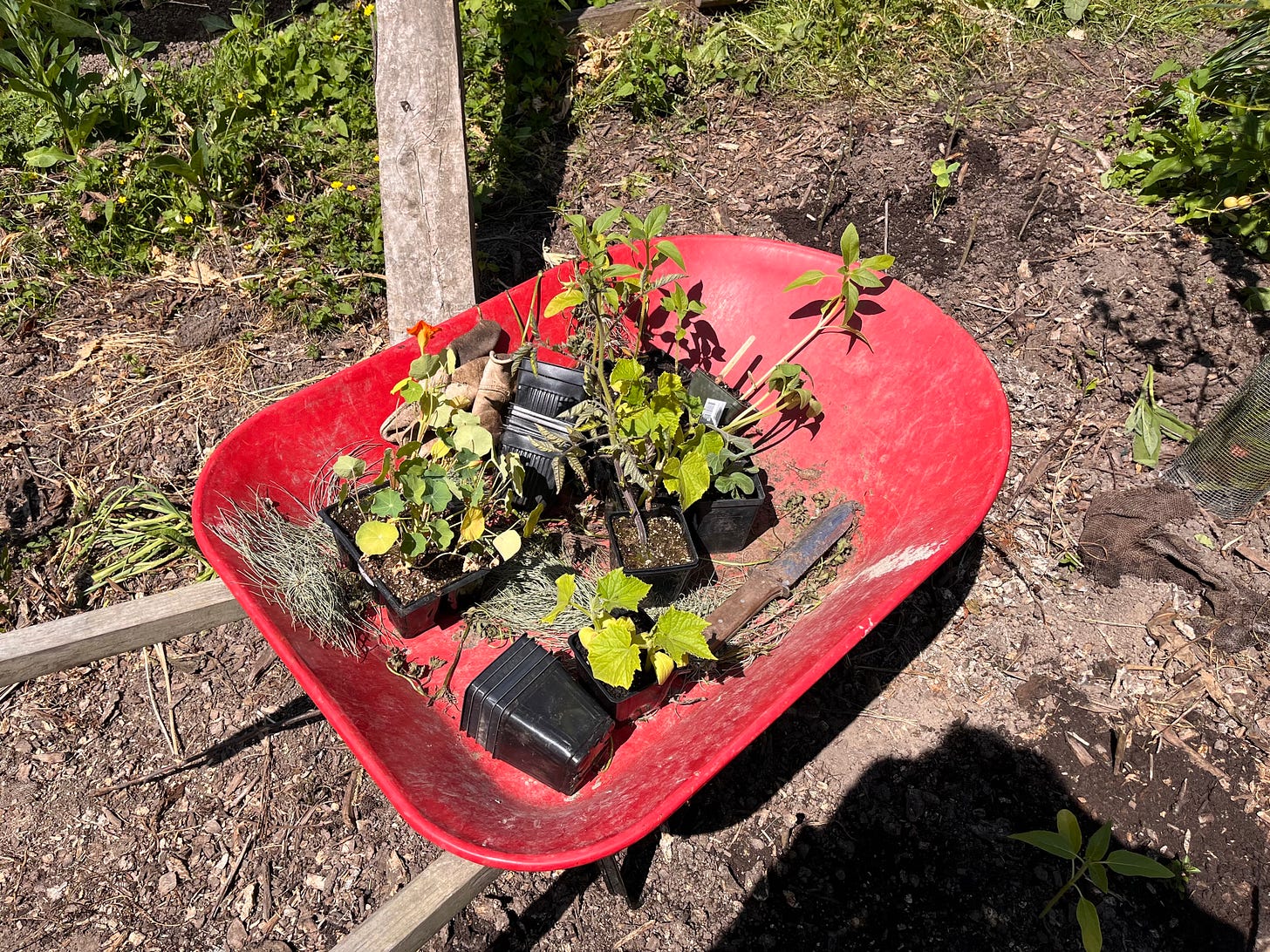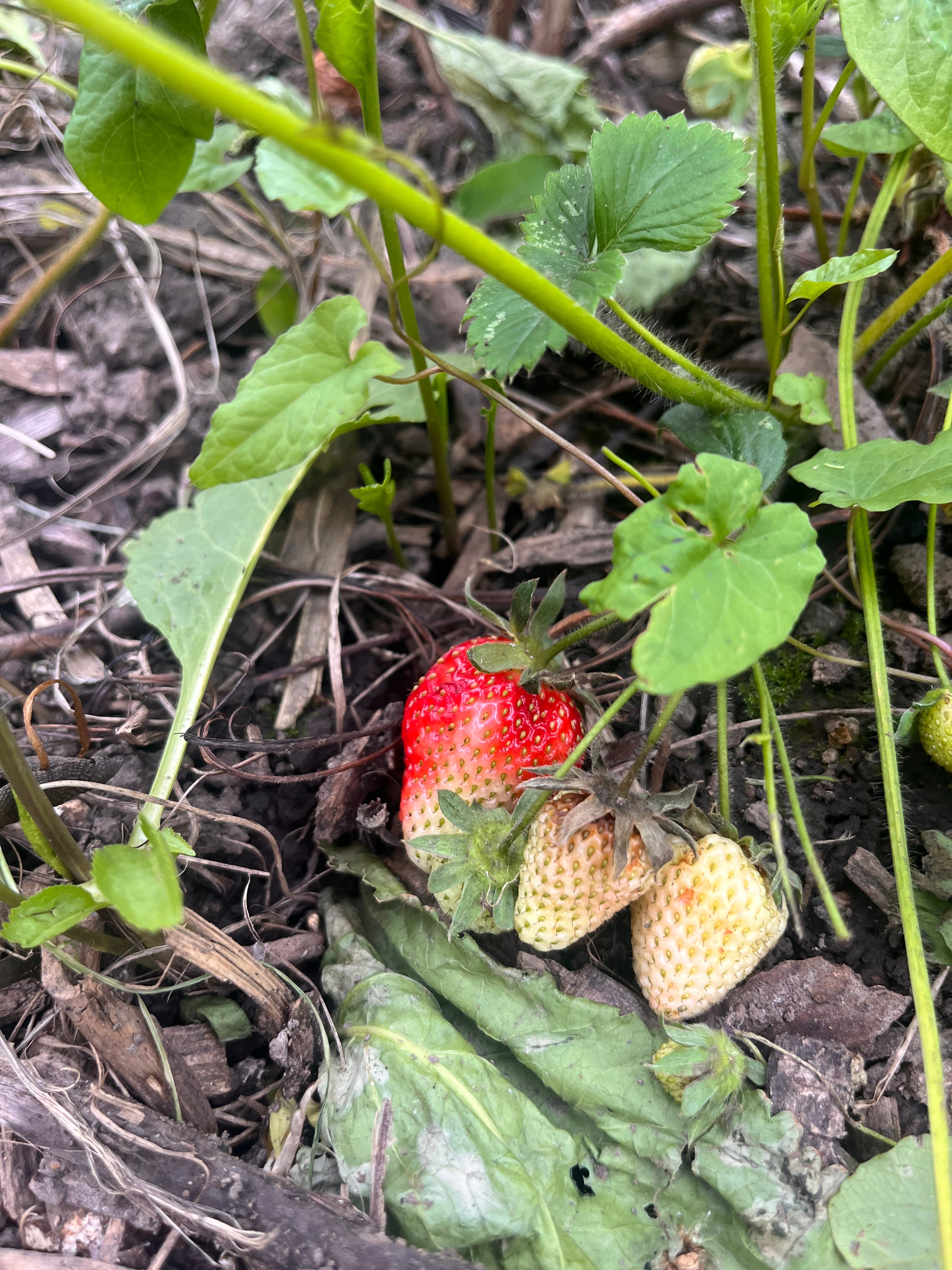 Kelly and Sharon move through the world of plants with a knowledge far deeper than mine, but I’m catching up with a kind of caffeinated hunger. Kelly’s hands are precise, pulling only bindweed, yellow dock, comfrey, and thistle, leaving the tender strawberries, silvery mugwort, and delicate starts of fruit trees to grow in peace.