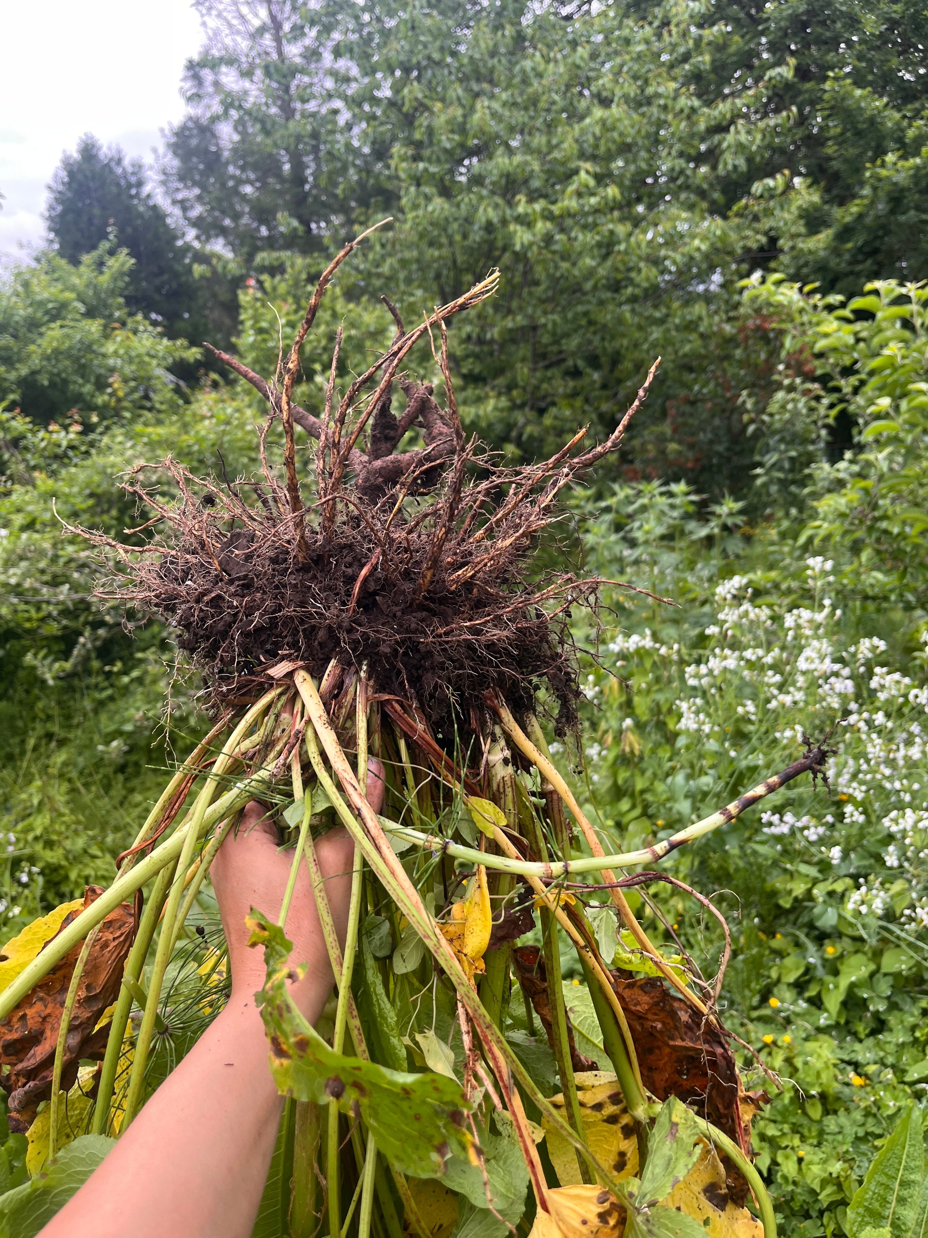 Sharon, Kelly and I spend twilight hours in a bliss, out amongst the tangle of the forest. There’s a joke in here somewhere about the softness of female company vs the heaving required to free yellow dock and other rooted interlopers from places they’ve overstayed. We throw our heads back in laughter and fall bottom-first to the hard earth after finally prying a stubborn horseradish from the ground. Mud on my knees and breath catching from laughter, I feel I am shedding an old skin.